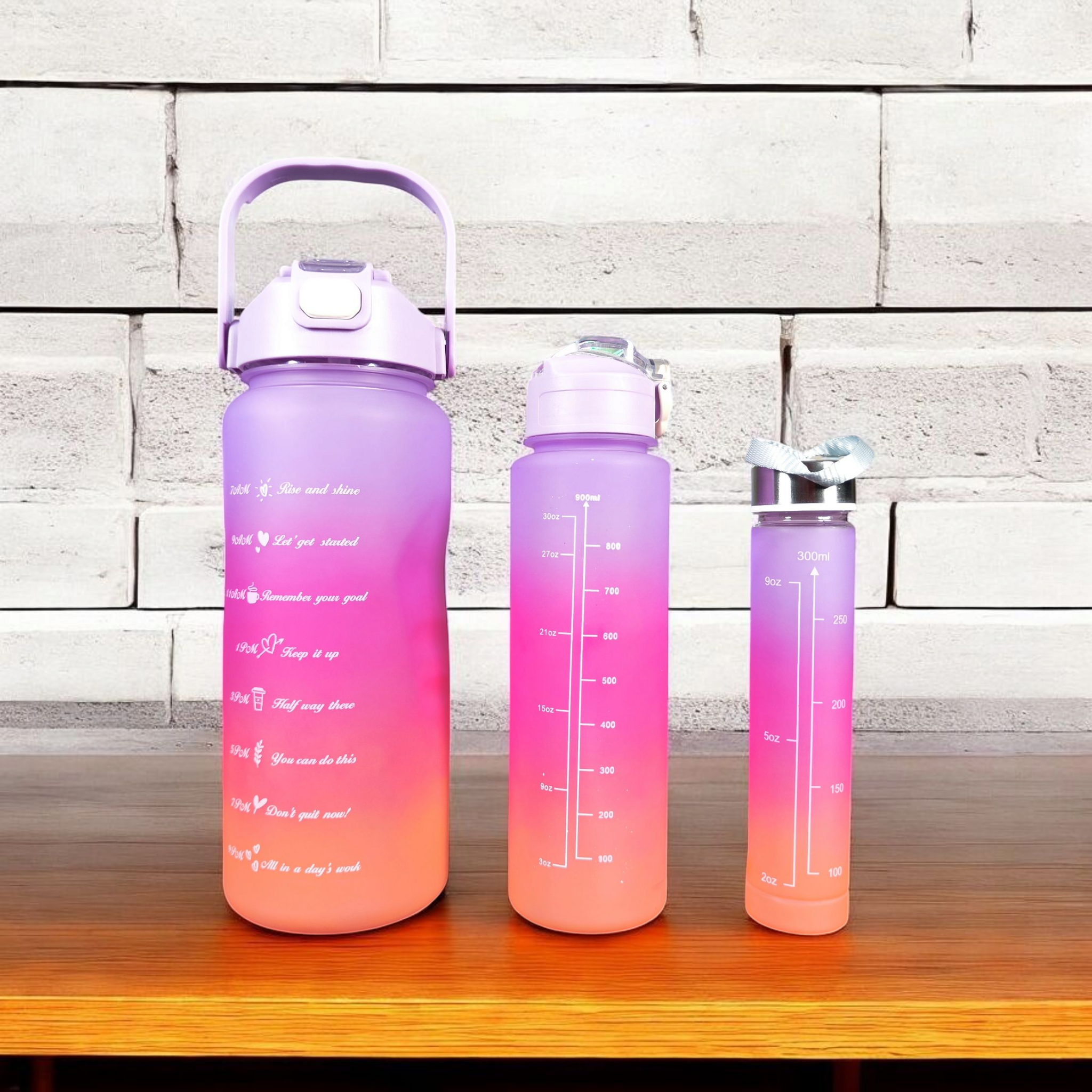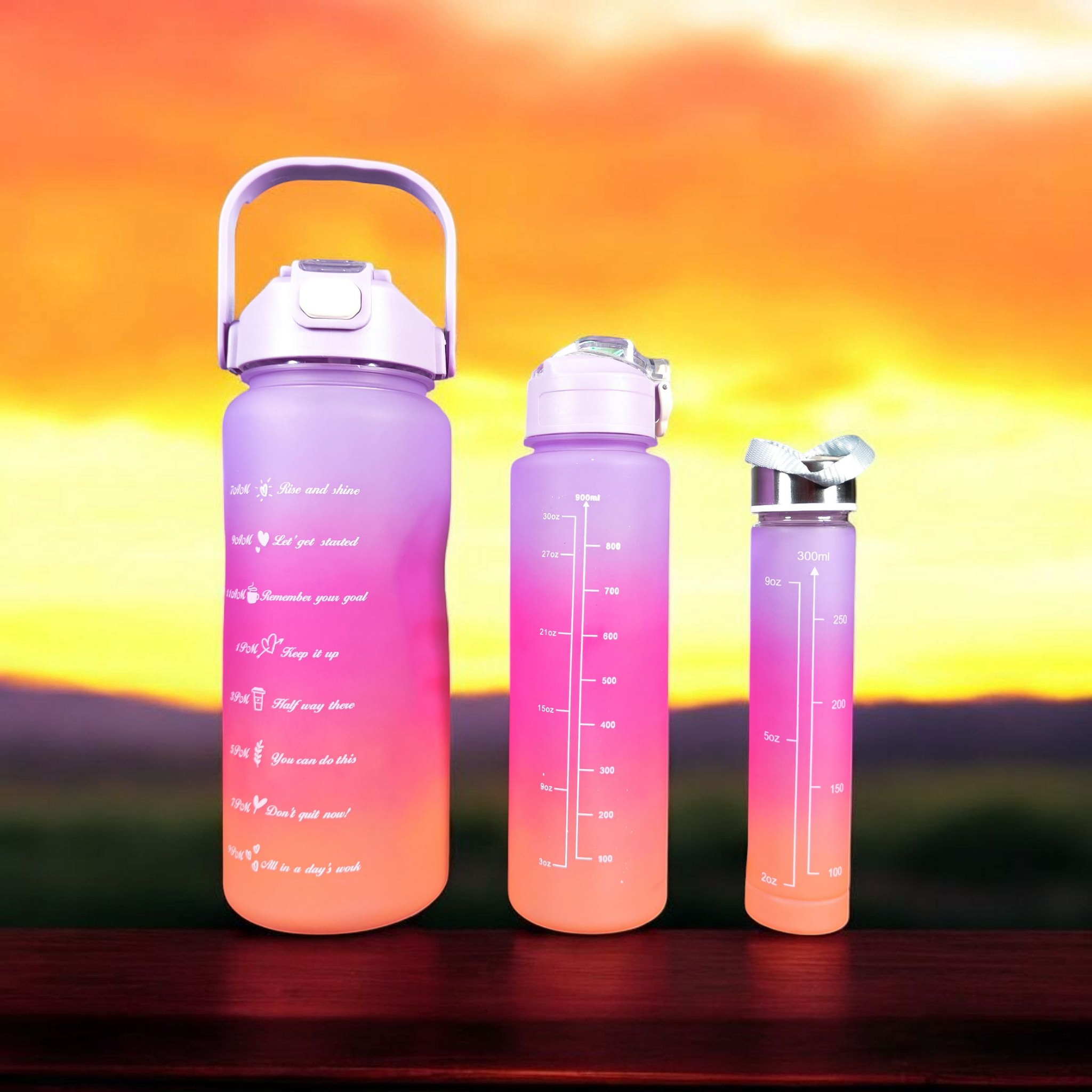 ست سه عددی قمقمه پلاستیکی شامل یک قمقمه 300 سی سی یک قمقمه 900 سی سی نی دار و یک قمقمه 2 لیتری نی دار ، دارای درب ضامن دار برای 2 لیتری و 900 سی سی ، دارای واشر سیلیکنی و دستگیره