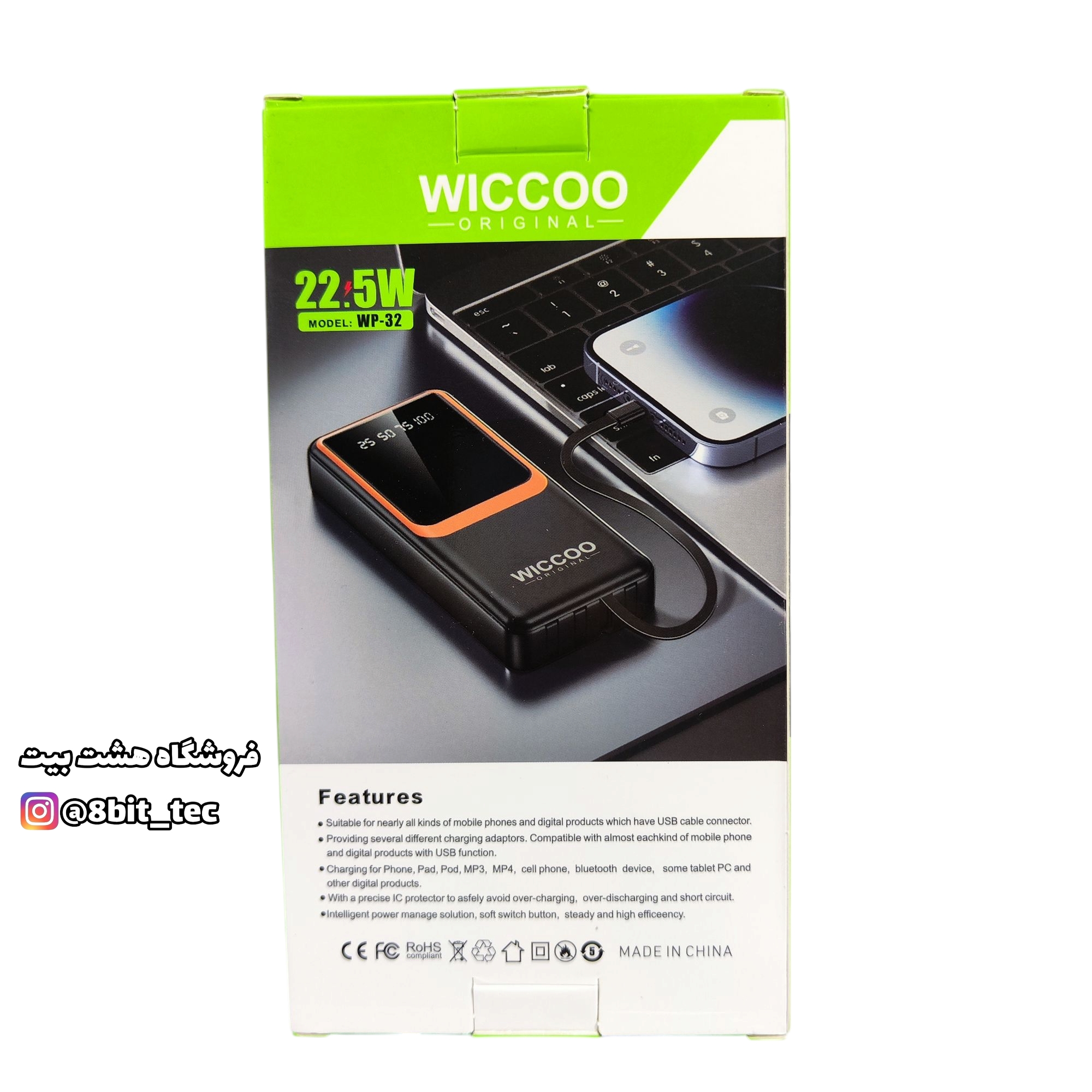 پاوربانک 30000 میلی آمپر wiccoo با 6 خروجی شارژ که شامل 4 خروجی فست شارژ با بیشینه 22.5 وات و همچنین 2 خروجی شارژ 10 وات معمولی یک پاور قدرتمند با توان و ظرفیت بالاست که مناسب کمپ و سفر و کوهنوردیست ، این پاور بانک 4 کابل متصل برای شارژ گوشیهای تابپ سی ، لایتنینگ و میکرو و یک یو اس بی ورودی شارژ فست شارژ هم دارد و خود دستگاه هم بصورت فست 18 وات شارژ میشود ، نشانگر درصد شارژ و همچنین کیفیت ساخت بسیار بالاست