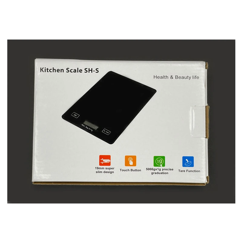 ترازوی آشپزخانه KITCHEN SCALE SHS با ظرفیت تا ۵ کیلوگرم و حساسیت ۱ گرم. مناسب وزنکشی جامدات و مایعات، دارای دو واحد اندازهگیری برای آب و شیر، بدنه پلاستیک با صفحه شیشهای و تغذیه باتری (دو نیمقلم). ارسال سریع و ضمانت اصالت