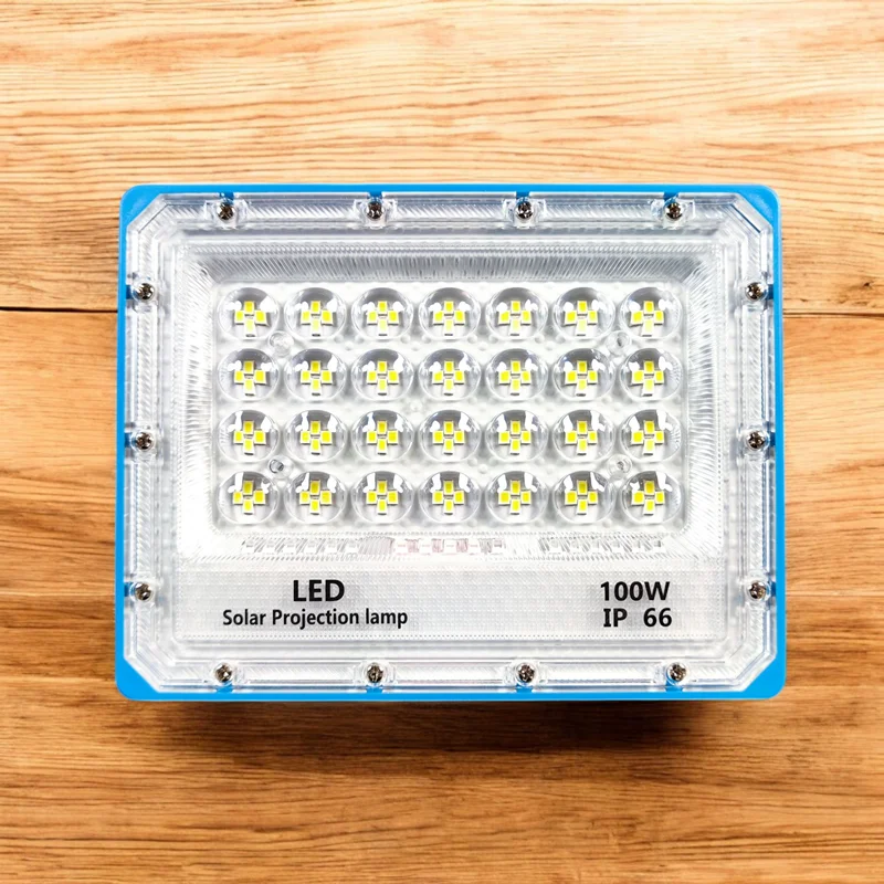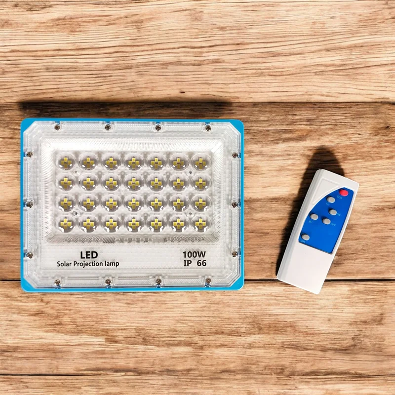 پروژکتور خورشیدی شارژی مدل w100 دارای یک پنل خورشیدی در قسمت پشت با ۱۱۲ ال ای دی پر نور ، دارای کنترل از راه دور و تایمر ، پایه فلزی قابل تنظیم برای نصب در سطوح مختلف و البته گواعی ضد آب ip66 ، این محصول جدای از پنل خورشیدی از طریق کابلتایپ سی هم شارژ میشود و به علاوه نور سفید نور پلیسی چشمک زن هم دارد