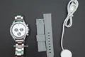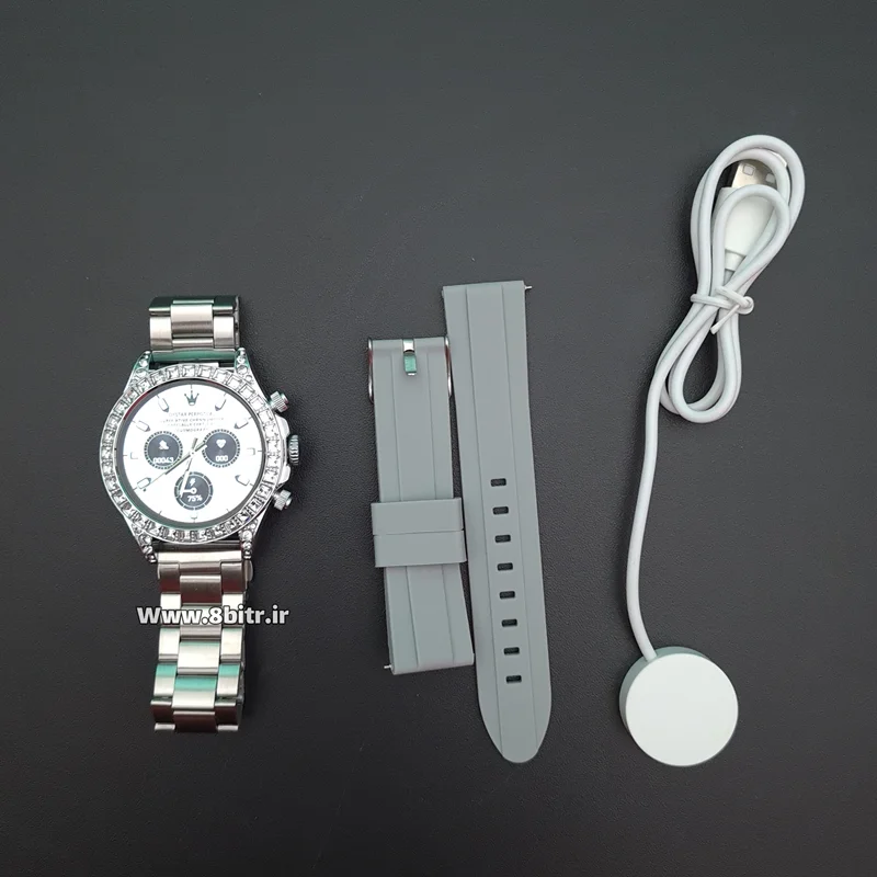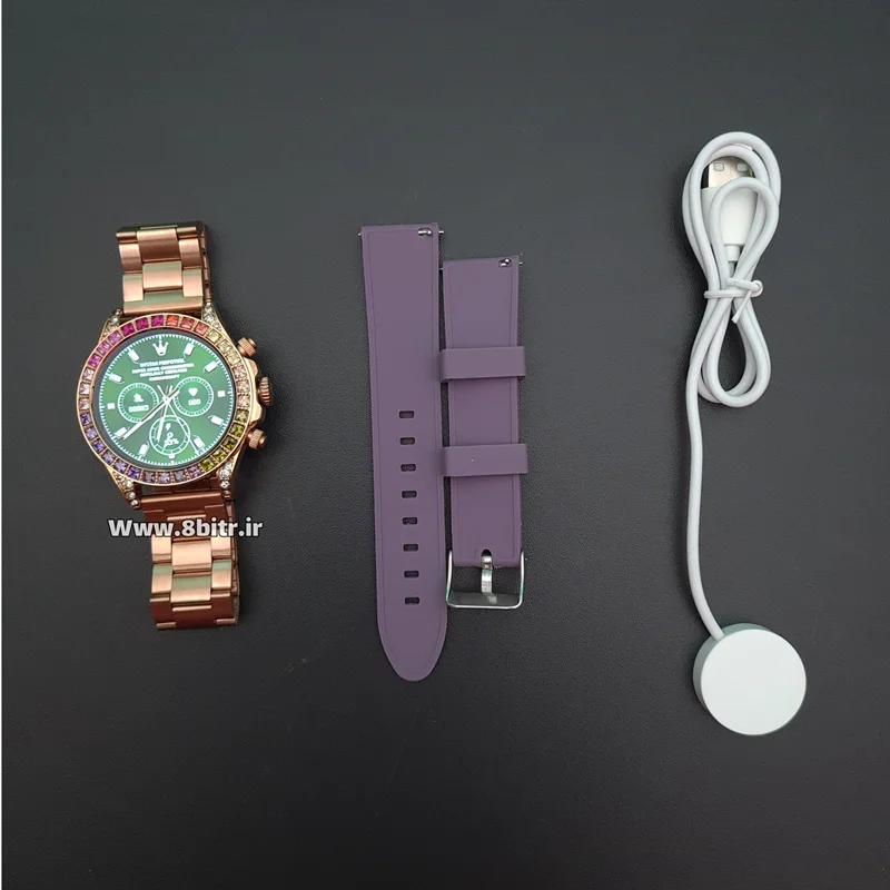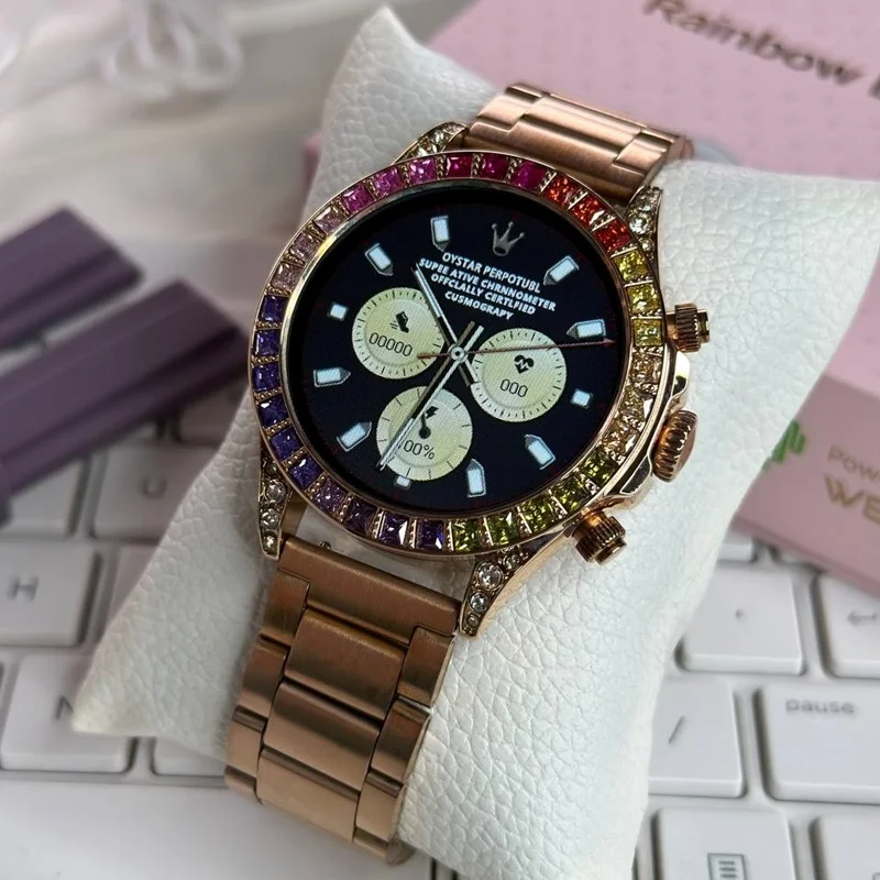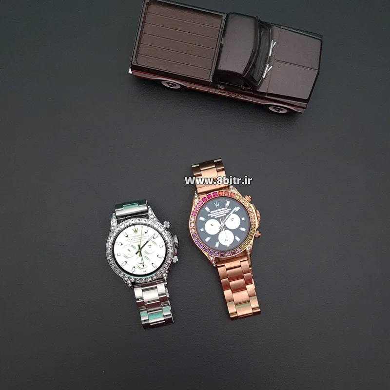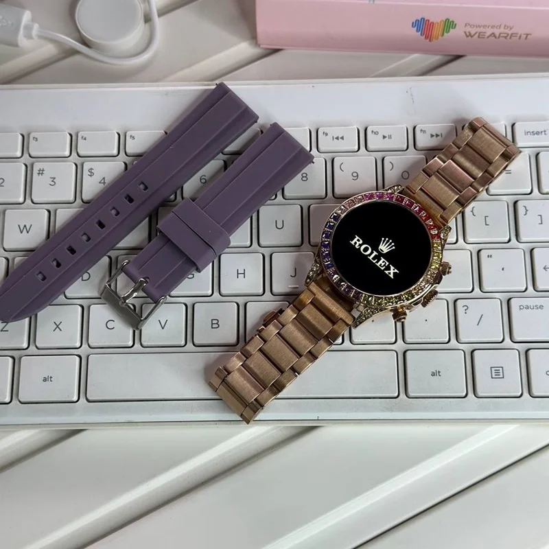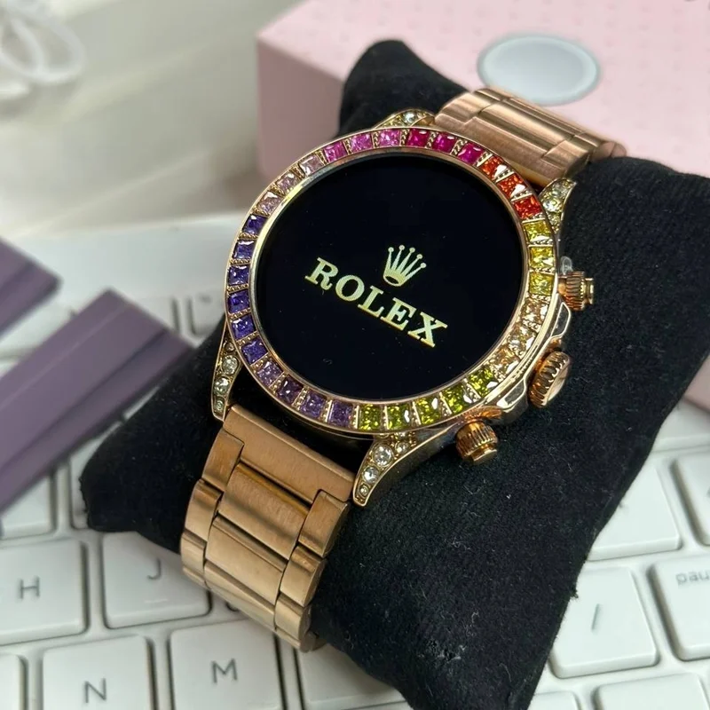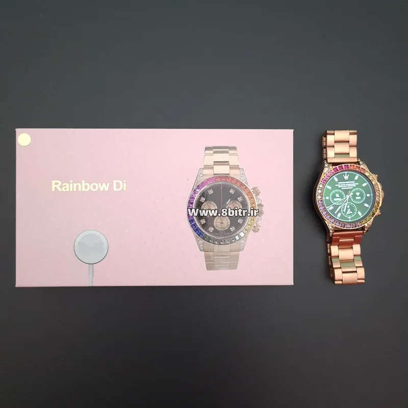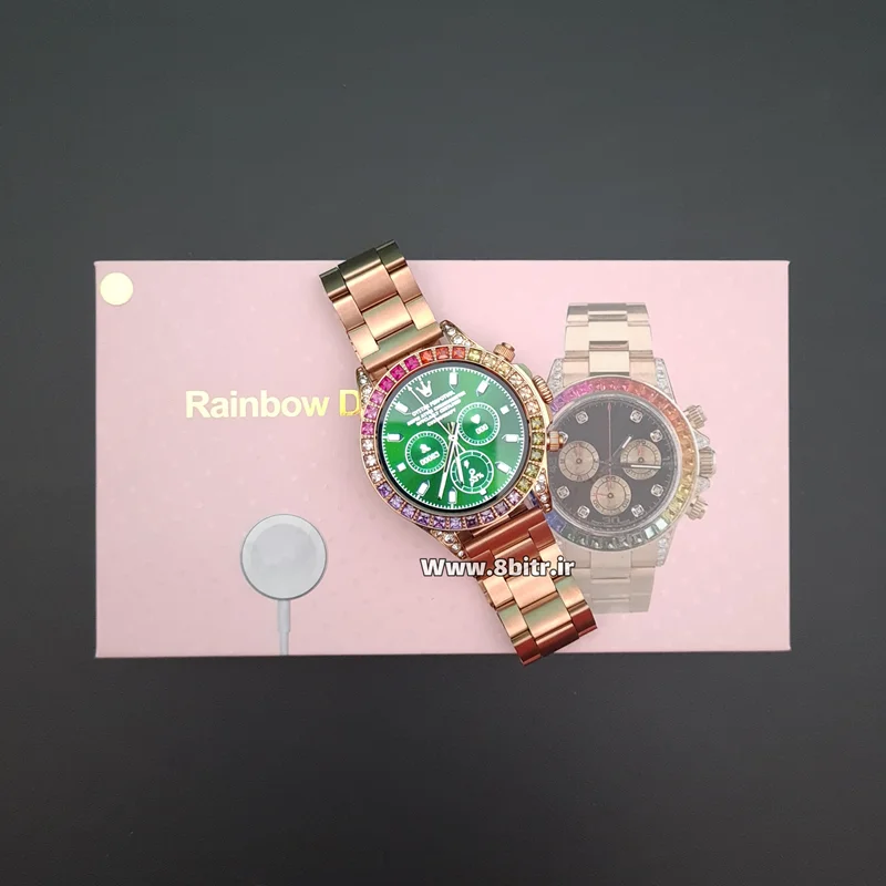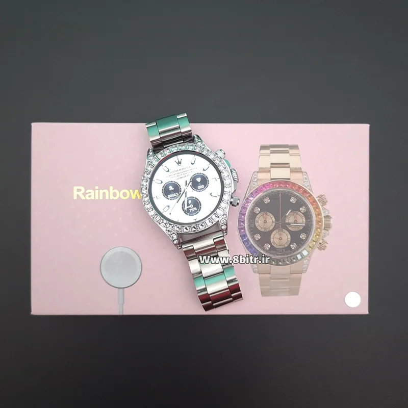 ساعت طرح رولکس رینبو بسیار با کیفیت از نظر بدنه و ساخت و سخت افزار ، دارای دو عدد بند فلزی و سیلیکُنی ، قابلیت های ورزشی مختلف گام شمار و کالری شمار و قابلیت های سلامتی مختلف از جمله ضربان قلب و فشار و... قابلیت نصب هزاران واچ فیس مختلف ، ساپورت کامل فارسی ، نمایش پیامها و نوتیف ها و کلی قابلیت هوشمند دیگه، دارای سه دکمه کناری ، جنس بدنه شیشه و فلز و سرامیک ، صفحه نمایش 35 میلی متری ، دارای شارژر وایرلس مگنتی بدون پین ، یک ساعت بسیار با کیفیت که مناسب هدیه هم هست